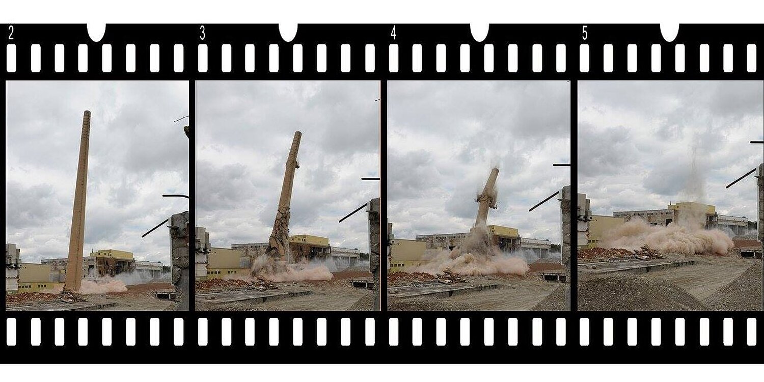 Sprengung des Mauerwerkschornstein am Nockerberg
